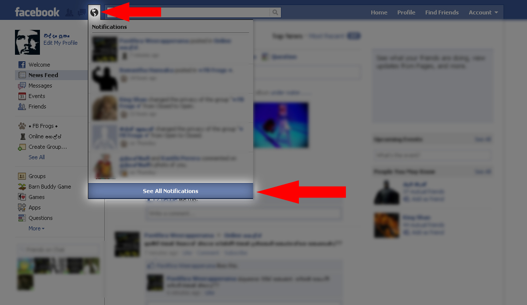 log වෙලා Notification Button එක Click කරන්න.පහල රූපෙ විදියට Notification list එකේ පල්ලෙහා තියෙන See All Notifications Click කරන්න